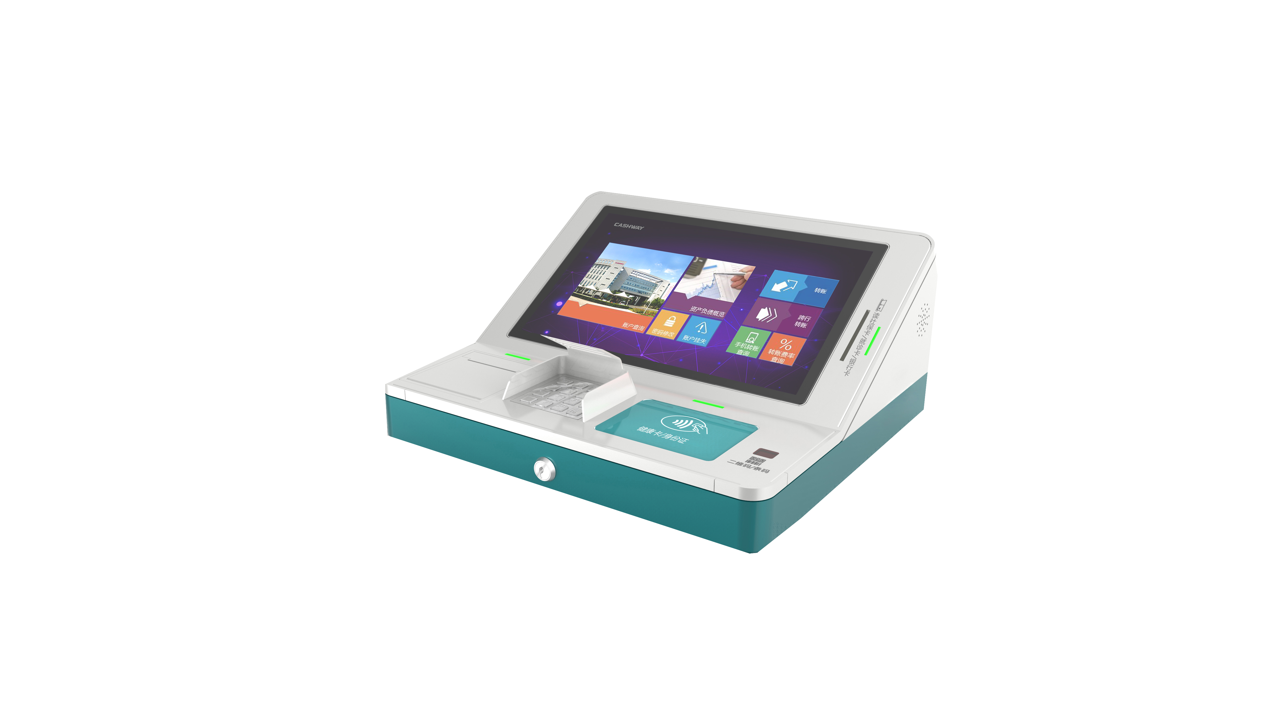 桌面型自助终端包括主控模块、显示模块、金融卡/医保卡读取模块、非接二合一读卡器、条码扫描器、银联密码键盘、凭条打印机等部分组成